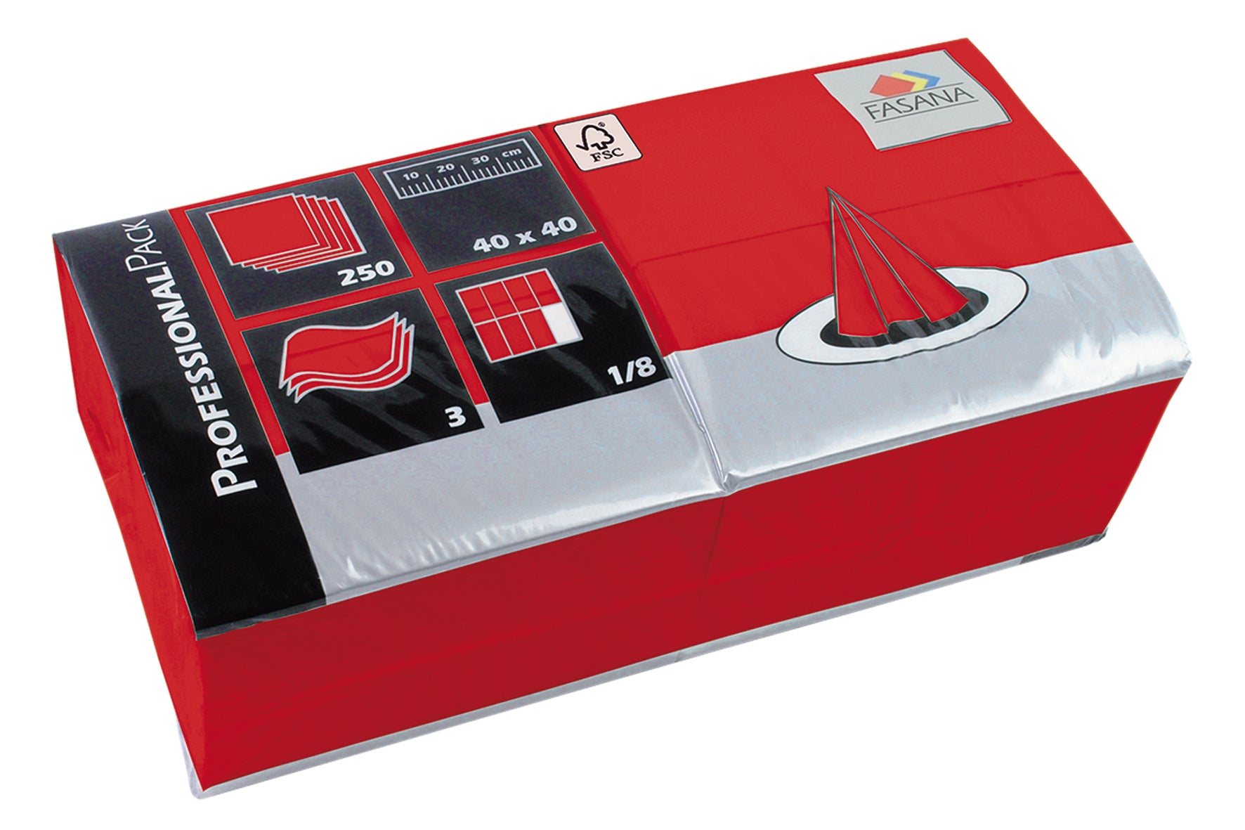 Erstklassige Fasana Servietten uni aus 3-lagiger Zellulose, 40 x 40 cm gross, in 1/8-Falz, verpackt in der praktischen Grosspackung à 250 Stück. Die extra weichen, angenehmen und besonders saugfähigen Servietten sind erhältlich in verschiedenen Farben.