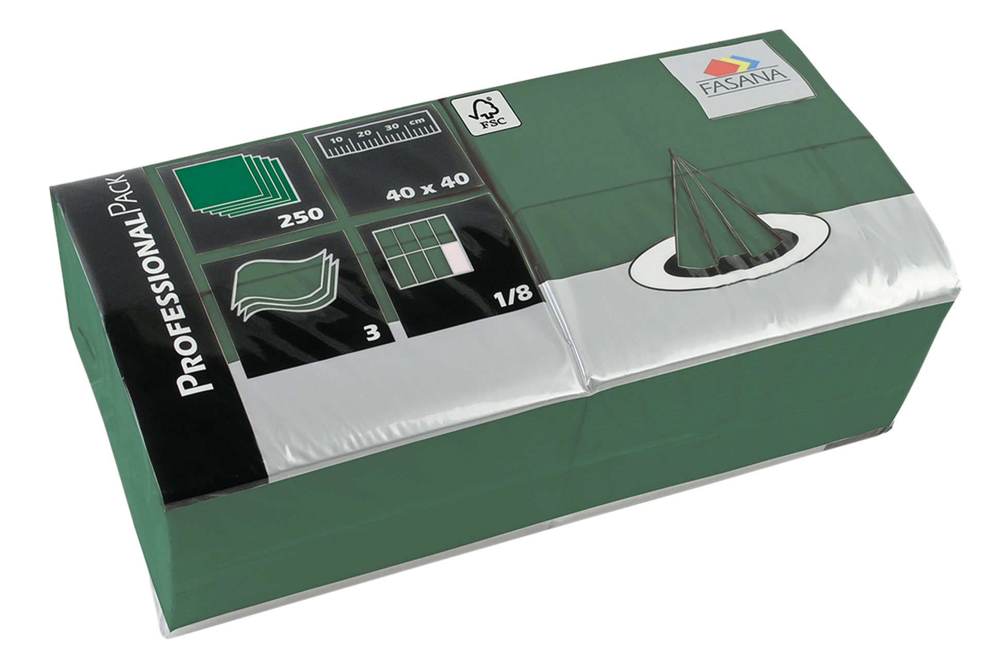 Erstklassige Fasana Servietten uni aus 3-lagiger Zellulose, 40 x 40 cm gross, in 1/8-Falz, verpackt in der praktischen Grosspackung à 250 Stück. Die extra weichen, angenehmen und besonders saugfähigen Servietten sind erhältlich in verschiedenen Farben.