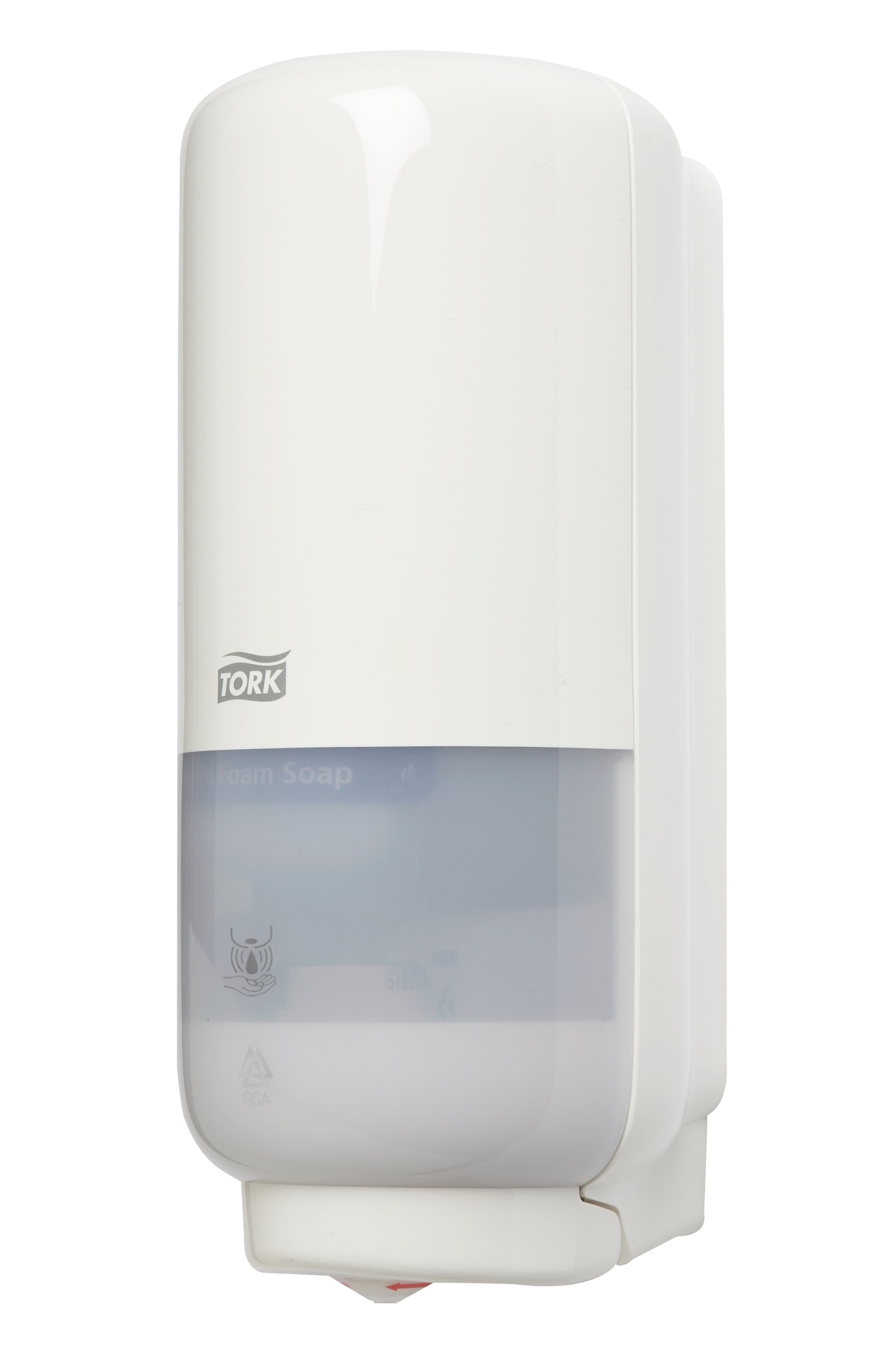 Weisser sensorgesteuerter Schaumseifenspender TORK Elevation S4 aus Kunststoff.