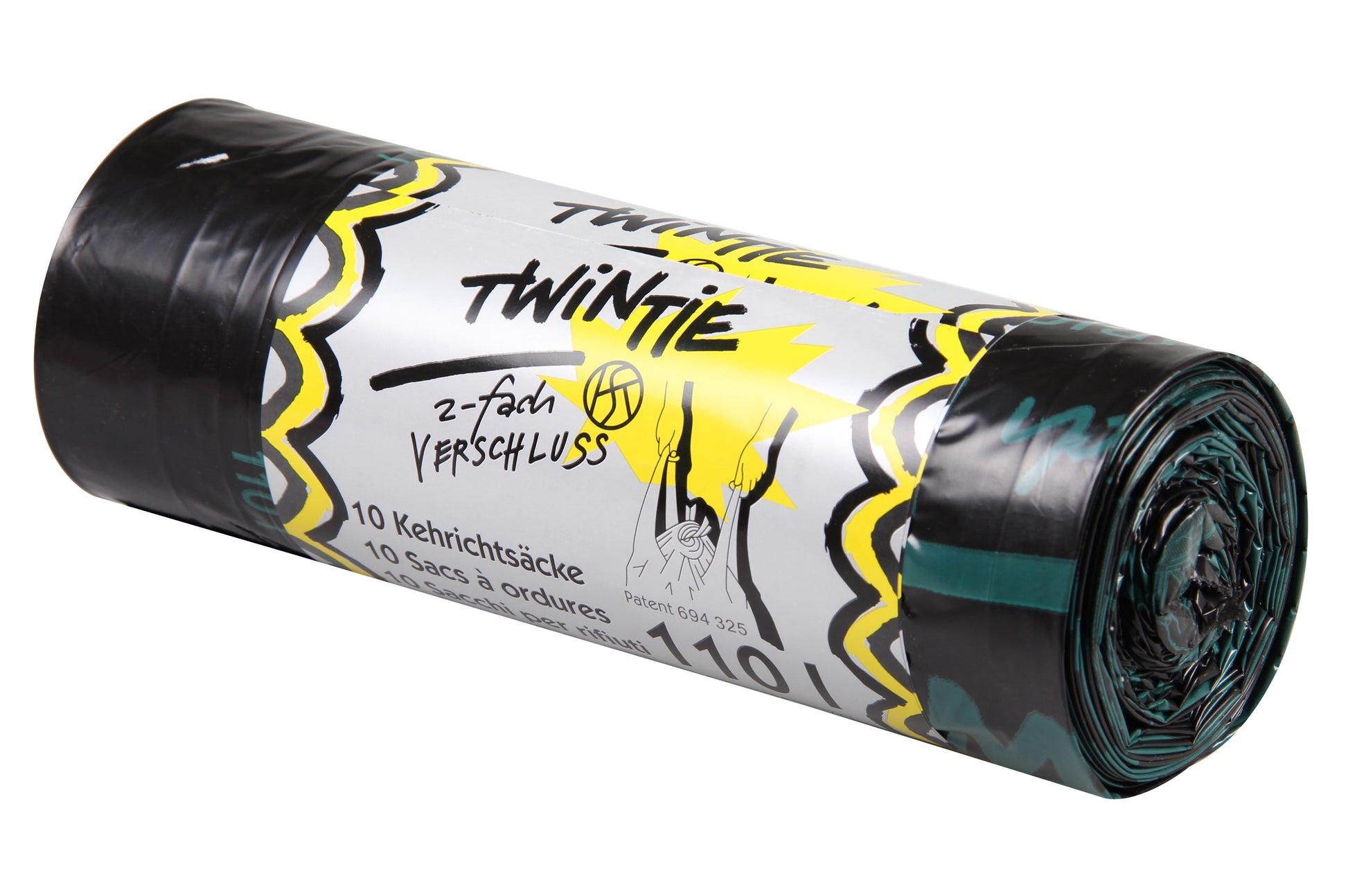 Kehrichtsäcke Twin Tie aus LDPE mit OKS, ausgestattet mit praktischem Zweifachverschluss. Diese Kehrichtsäcke sind hergestellt aus weichem, dehnbarem LDPE (low density polyethylen) und zugelassen als OKS (offizieller Kehrichtsack Schweiz), eine durch den Städteverband festgelegte Sammlung an Qualitätskriterien (Durchstossfestigkeit, Nahtfestigkeit, Einfärbung, etc.). Erhältlich in verschiedenen Grössen und Dicken.