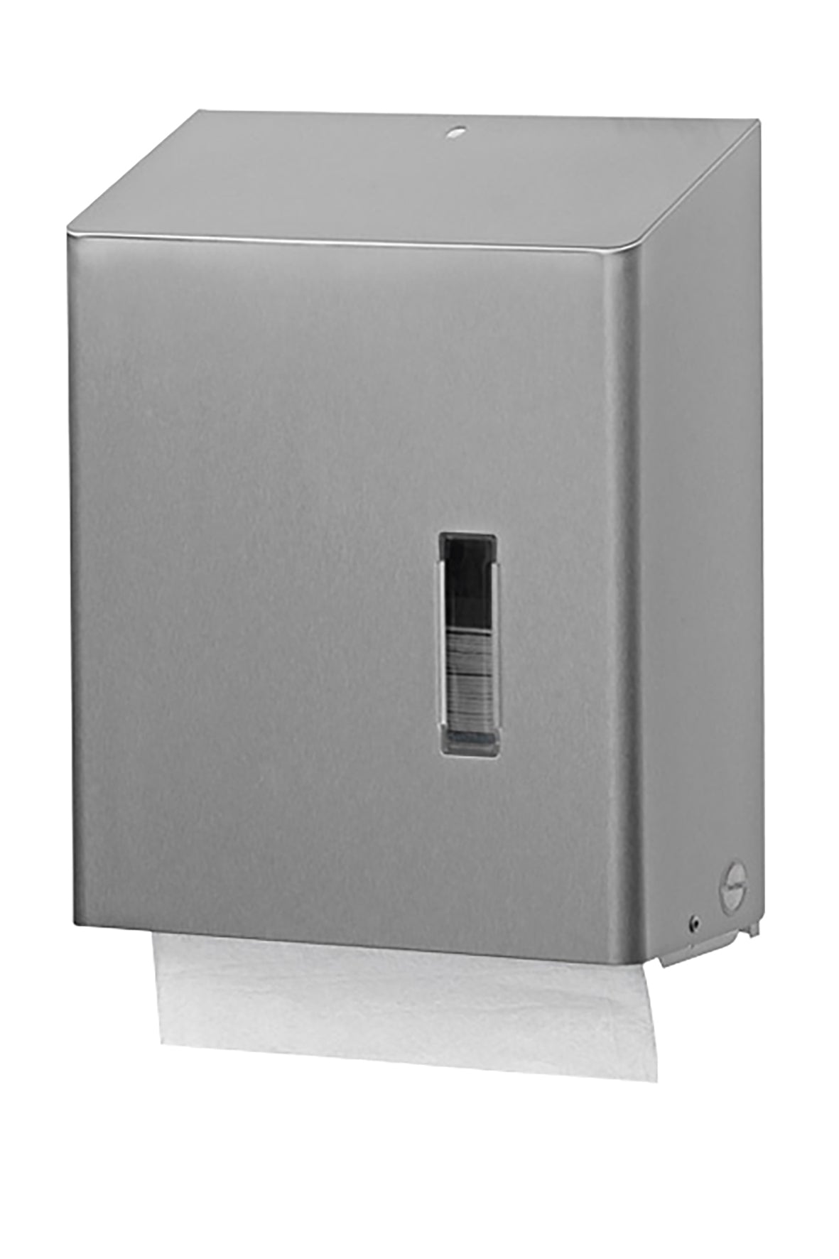 Papierhandtuchspender für Standardpapier C- und V-Falz, Füllmenge 750 Blatt. Einsetzbar für Papiere mit einer maximalen Bundabmessung von T 13.3 cm x B 27.8 x H 35.0. Der HSU 31 E AFP verfügt über ein abschliessbares Gehäuse aus geschweisstem, geschliffenem Edelstahl mit Anti-Fingerprint-Beschichtung (AFP) und über ein Sichtfenster zur Füllstandkontrolle. Standardmässig ist der Spender ausgerüstet mit einer Papierentnahmevorrichtung aus Kunststoff. Dieser Spender ist geeignet für die Wandmontage. Das Produkt ist verpackt im Karton à 1 Spender.