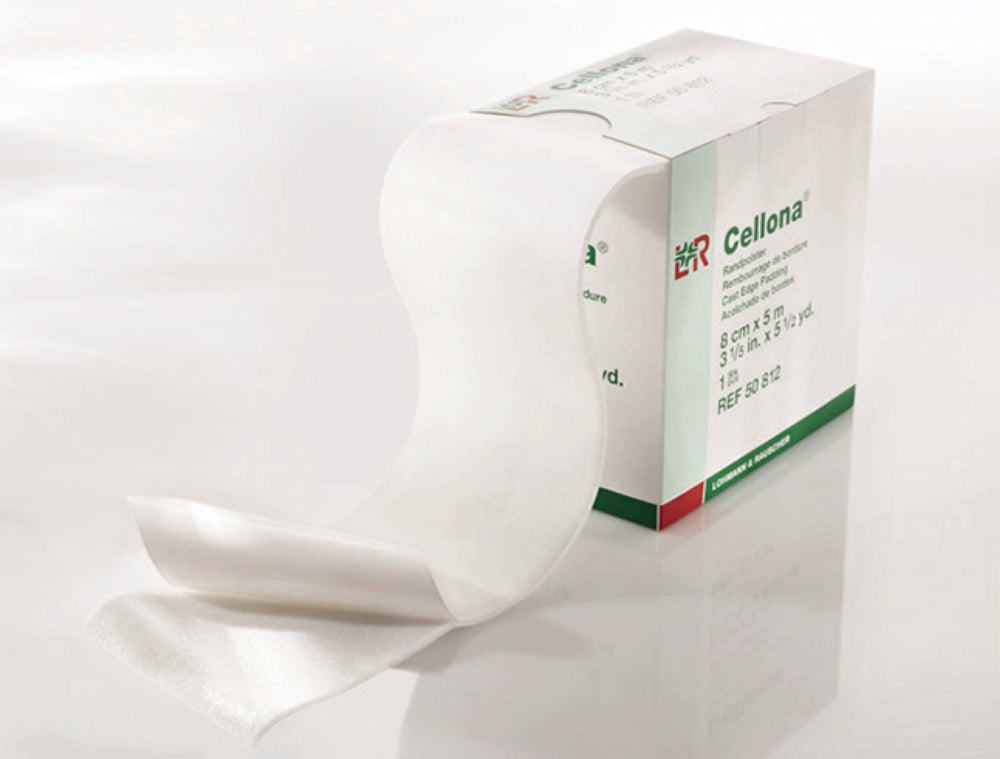 Das Cellona Randpolster dient der Randpolsterung von Gips- und Kunststoffverbänden. Es besteht aus vernadeltem Vliesstoff (Polyester, Polypropylen, Viskose), der auf einer Seite mit einem Lösemittelacrylatklebstoff beschichtet ist. Die klebende Seite ist mit einem weissen, einseitig silikonisierten Papier abgedeckt.