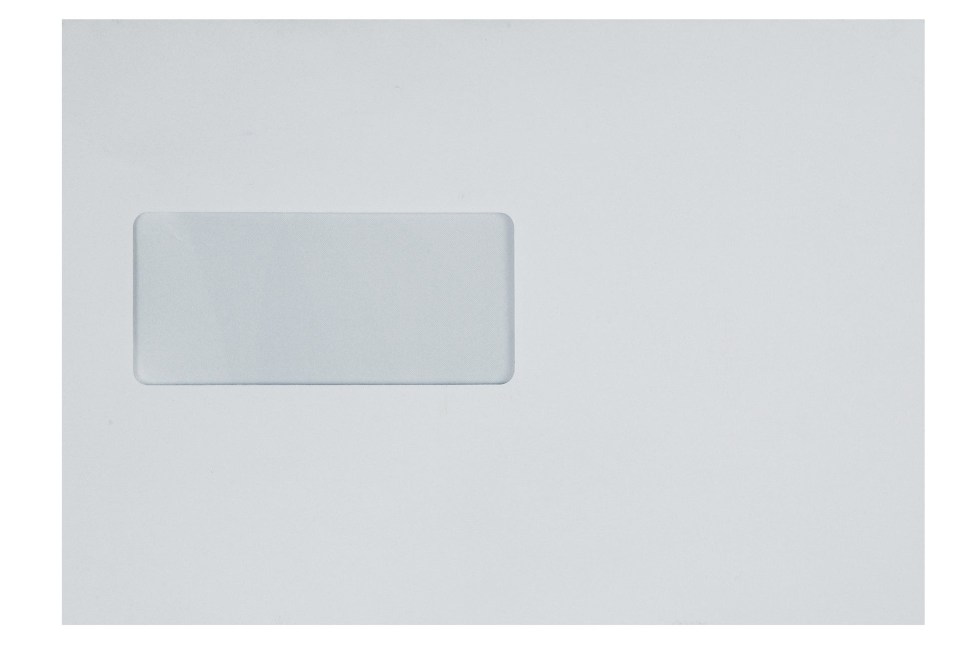 Hochweisse Briefumschläge mit grauer Innenseite und Klappe mit Haftklebeverschluss, im Format C5. FSC zertifiziert.