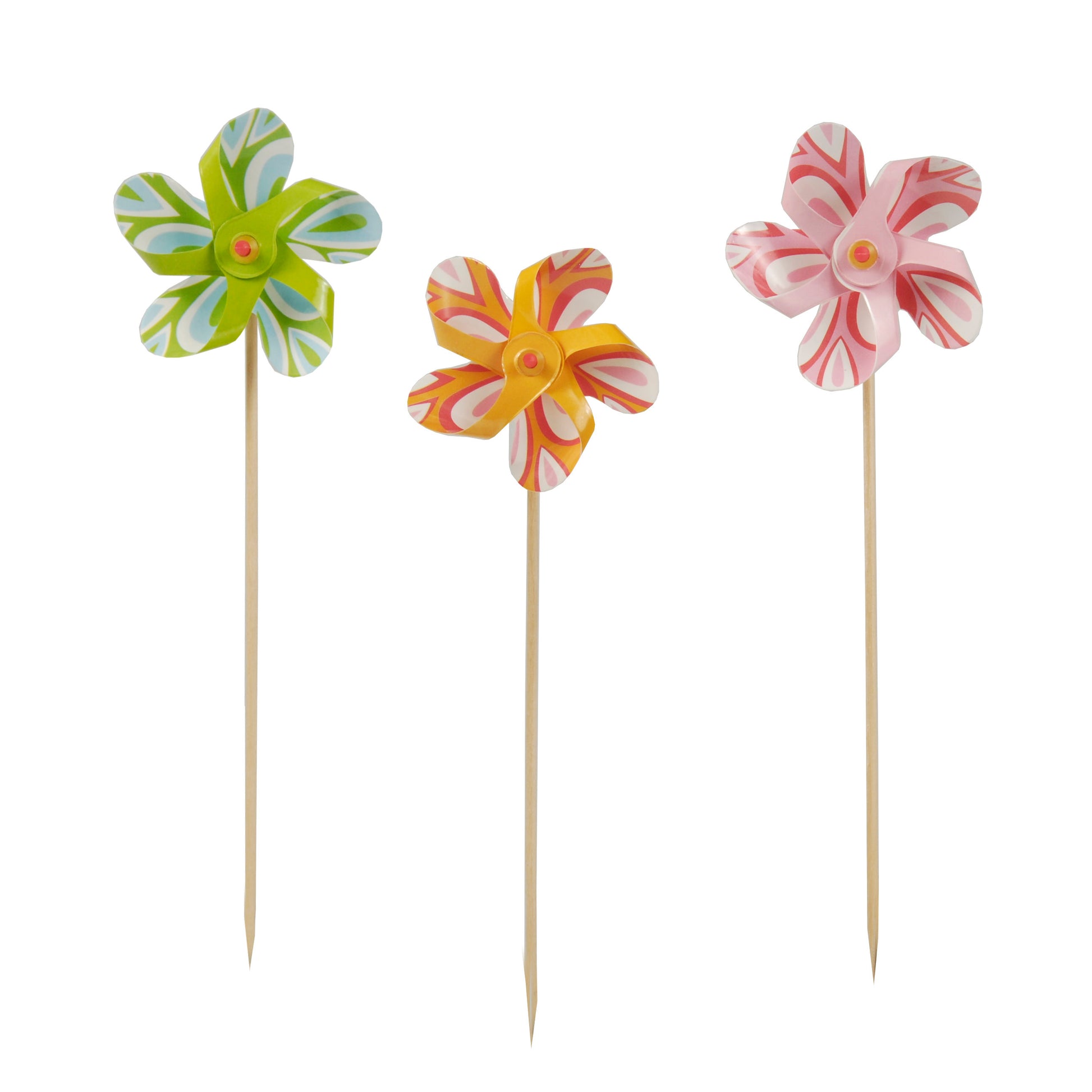 Deko-Picker zum Dekorieren von Speisen, Apéro-Häppchen. Die Deko-Picker bestehen aus einem Holzspiesschen und einer funktionstüchtigen, stabilen Windmühle aus PET in den frischen Farben hellblau, hellgrün, orange und rosa. Die Deko-Picker haben eine Länge von 17.5 cm und sind farbig assortiert verpackt in der Box à 50 Stück.