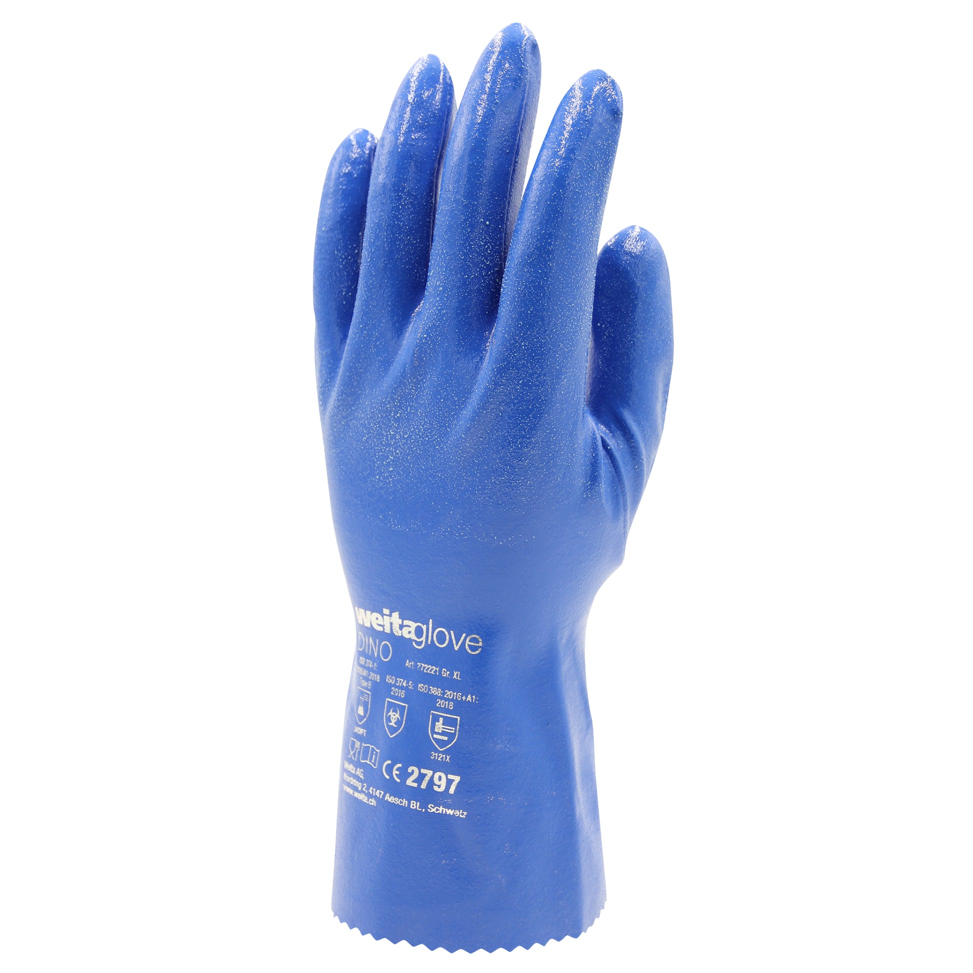Handschuh aus Nitril Butadiene Kautschuk (NBR) für Industrie, Haushalt, Garten und Hobby. Textilinnenfutter aus 100% Baumwolle. Sehr stark und schnittfest, antiallergisch. Gute Kälte- und Wärmeisolation. Gute Beständigkeit gegen die meisten Chemikalien, Oele und Fette. Sehr guter Griff durch rauhe Oberflächenstruktur. Stich-, abrieb- und schnittfest.