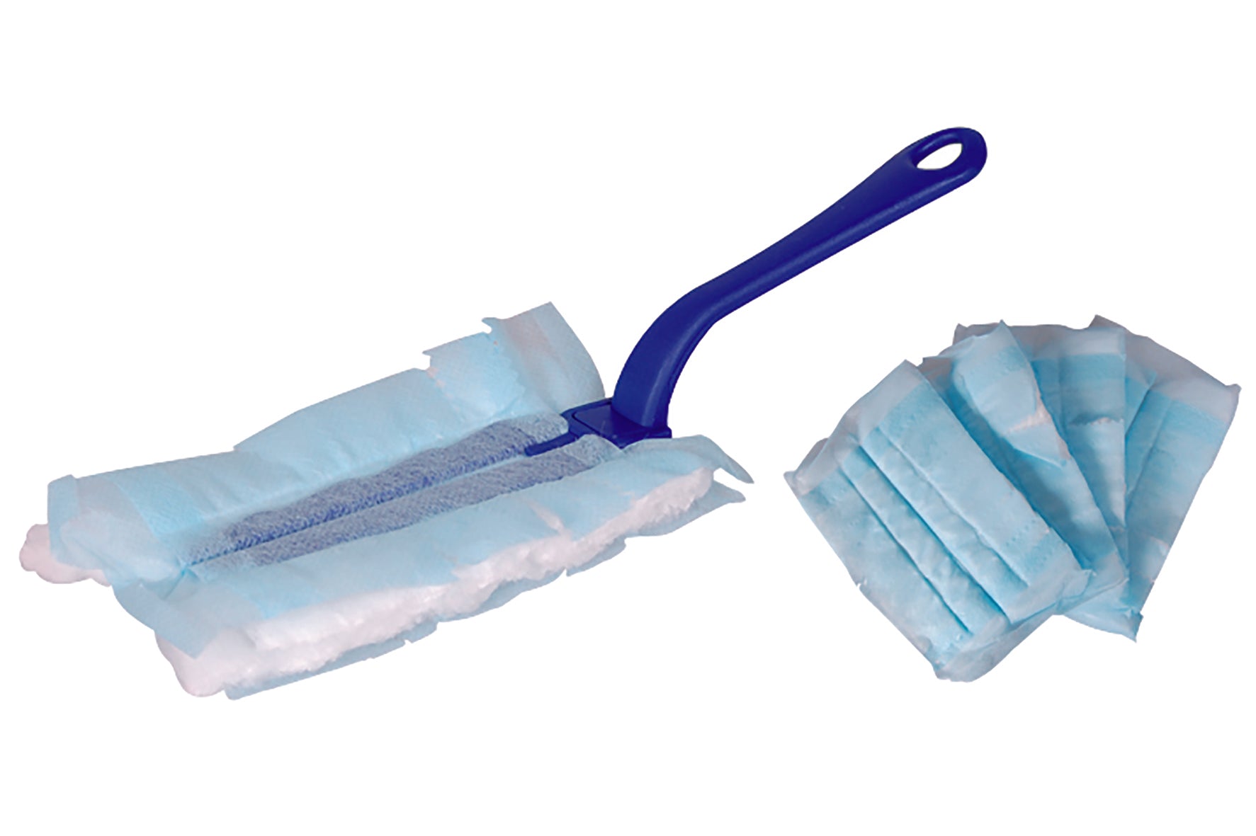 Set mit einem blauen Handgriff und 5 Staubfang-Tücher zum Abstauben von Möbeln und Gegenständen.