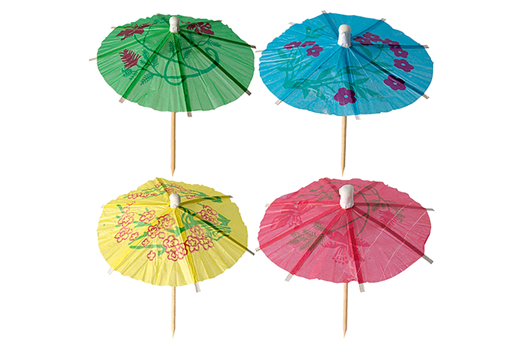 Deko-Picker zum Dekorieren von Glaces, Coupes, Apéro-Häppchen oder Cocktails. Die Deko-Picker bestehen aus einem Holzspiesschen und einem Schirmchen aus Papier, mit 4 verschiedenen Blumenmotiven Asia, in 4 Farben: blau, gelb, grün und rot. Die Deko-Picker haben eine Länge von 10 cm und sind verpackt im Pack à 144 Stück.