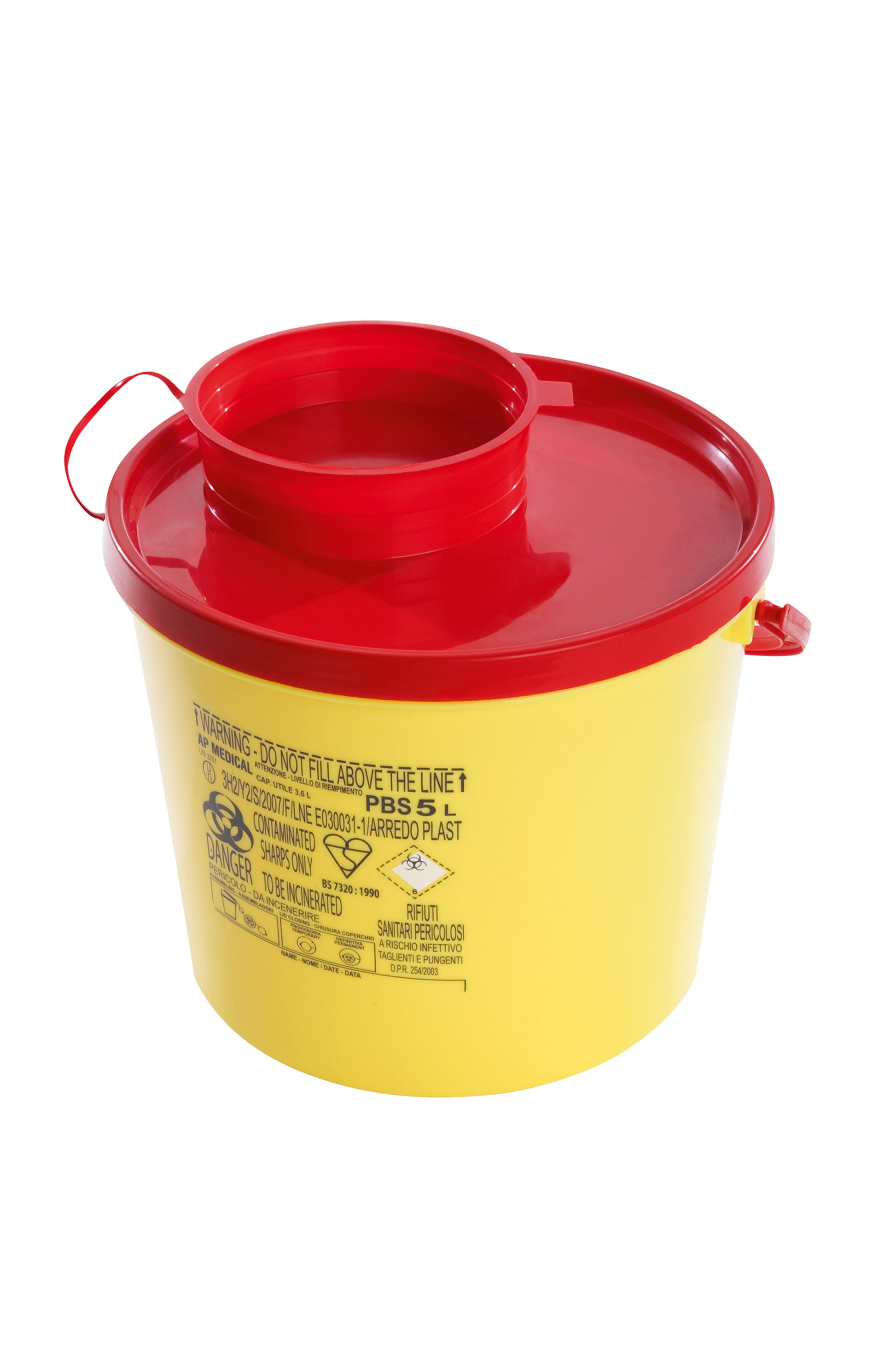Entsorgungsbox PBS aus Kunststoff, mit Deckel und einer Kapazität von 0.8 Litern. Die Entsorgungsbox ist geeignet für die Entsorgung von spitzen, scharfen und auch kontaminierten Gegenständen, wie z.B. Nadeln, Skalpelle etc. ,