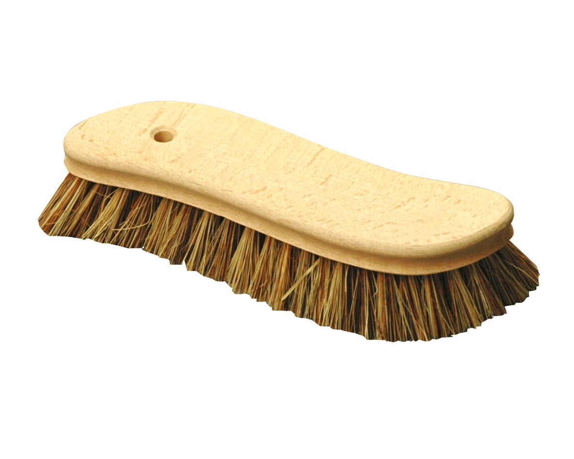 Holzfegbürste S-förmig. Körper aus Buchenholz FSC roh, Besatz aus Union (Gemisch Fibre und Bassine). Bodenbürsten, Oberflächenbürste, handbürsten, Handfegburste
