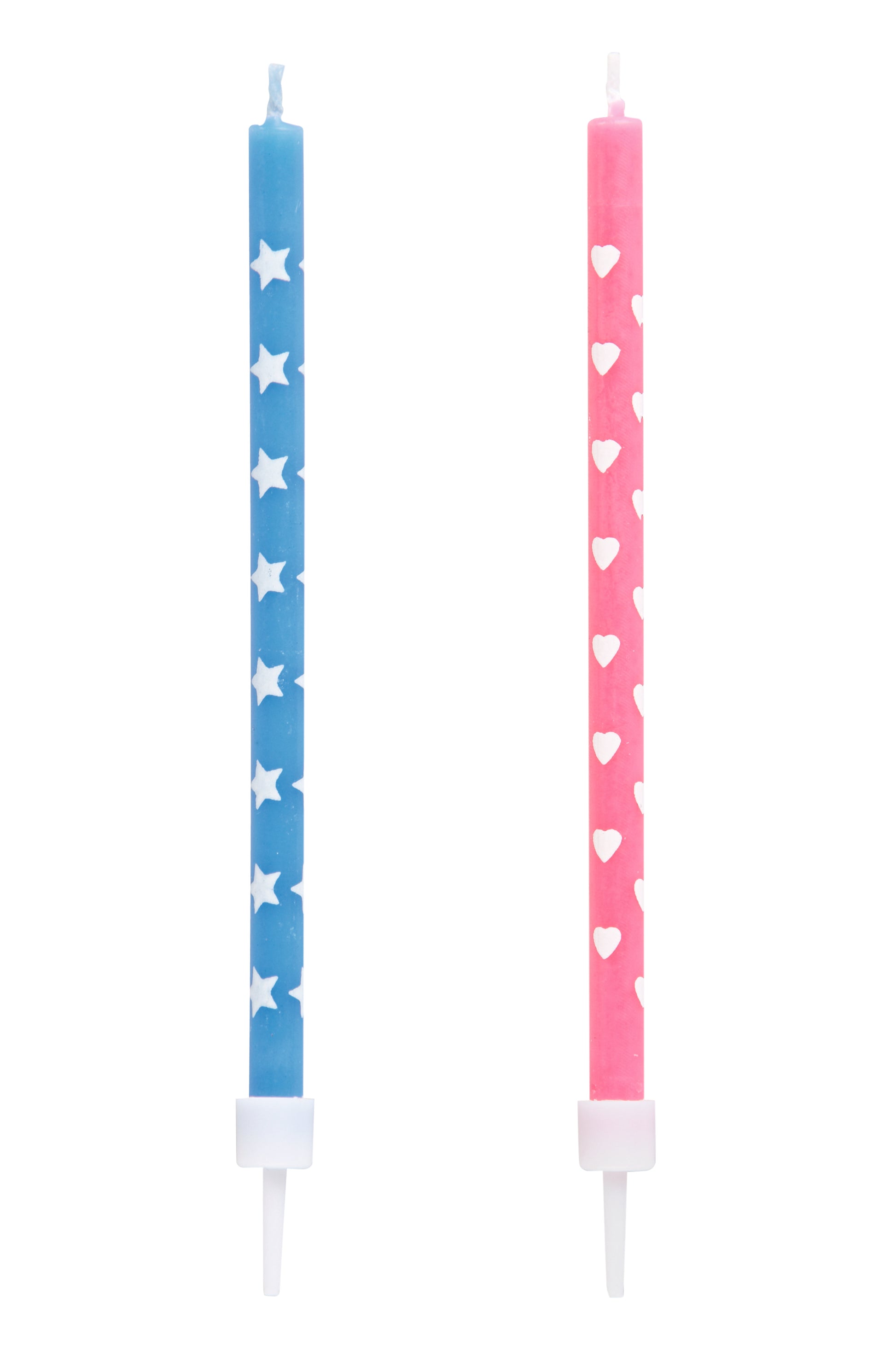 Zwölf bunte Geburtstagskerzen befinden sich samt Halter in einer Packung. Im Karton sind jeweils fünf Packungen mit blauen und fünf Packungen mit pinken Kerzen.