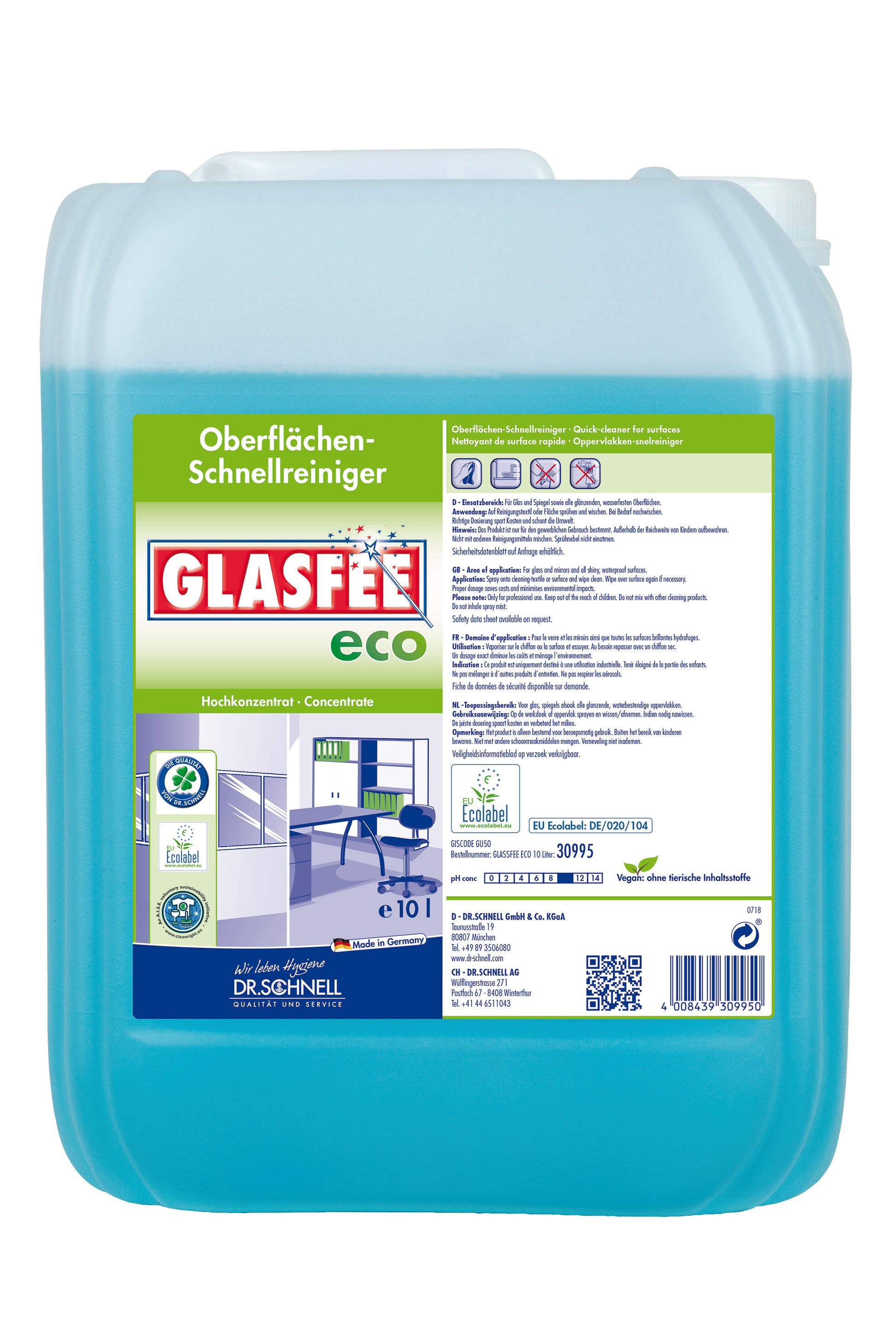 GLASFEE ECO ist ein gebrauchsfertiger, ökologischer Oberflächen-Schnellreiniger in verschiedenen Gebindegrössen.