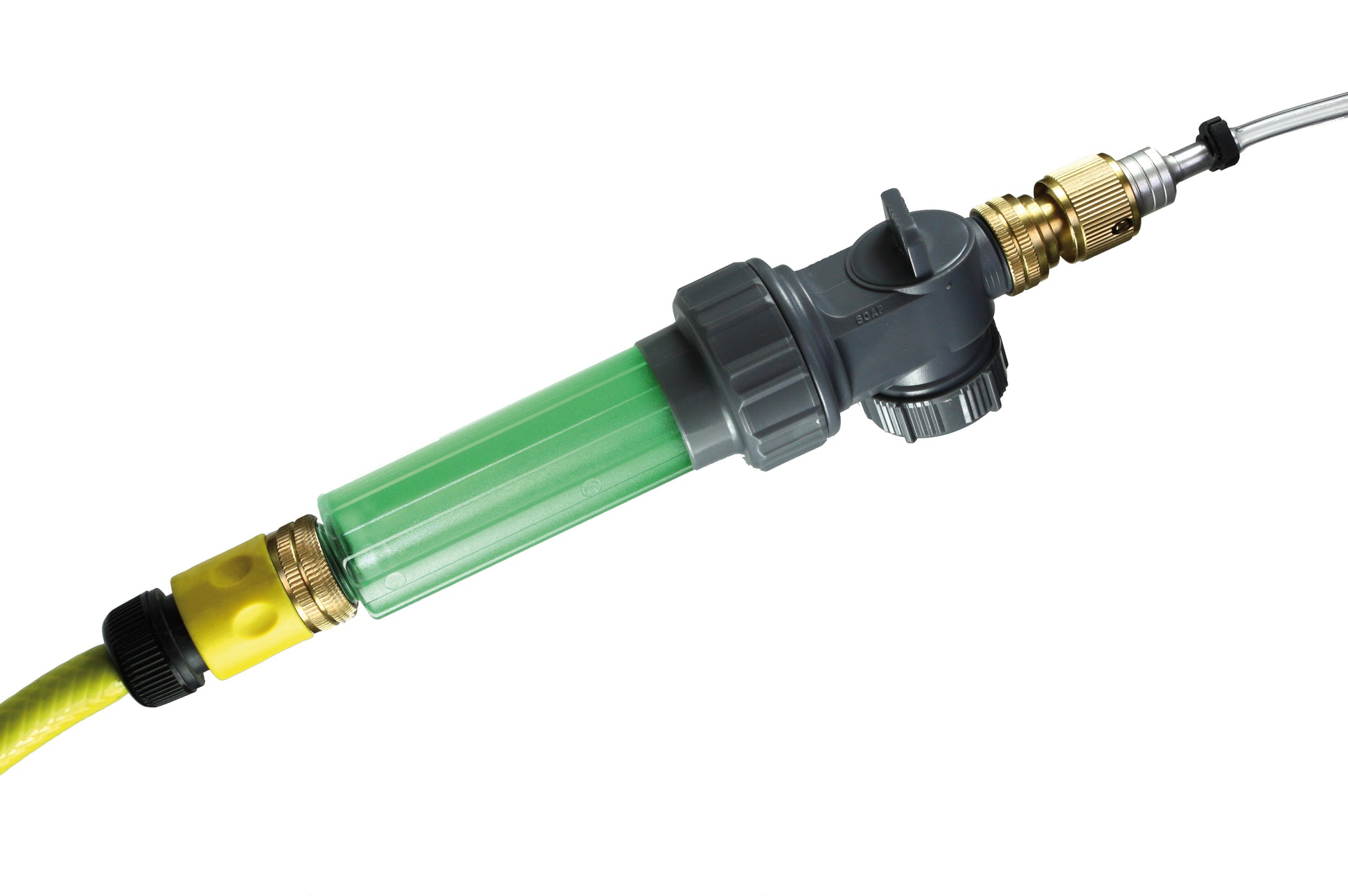 Der Seifendosierer HiFlo mischt Seife ins Reinwasser und lässt sich einfach wieder auffüllen. Anschliessen kann man ihn an jeden gewöhnlichen Gartenschlauch.