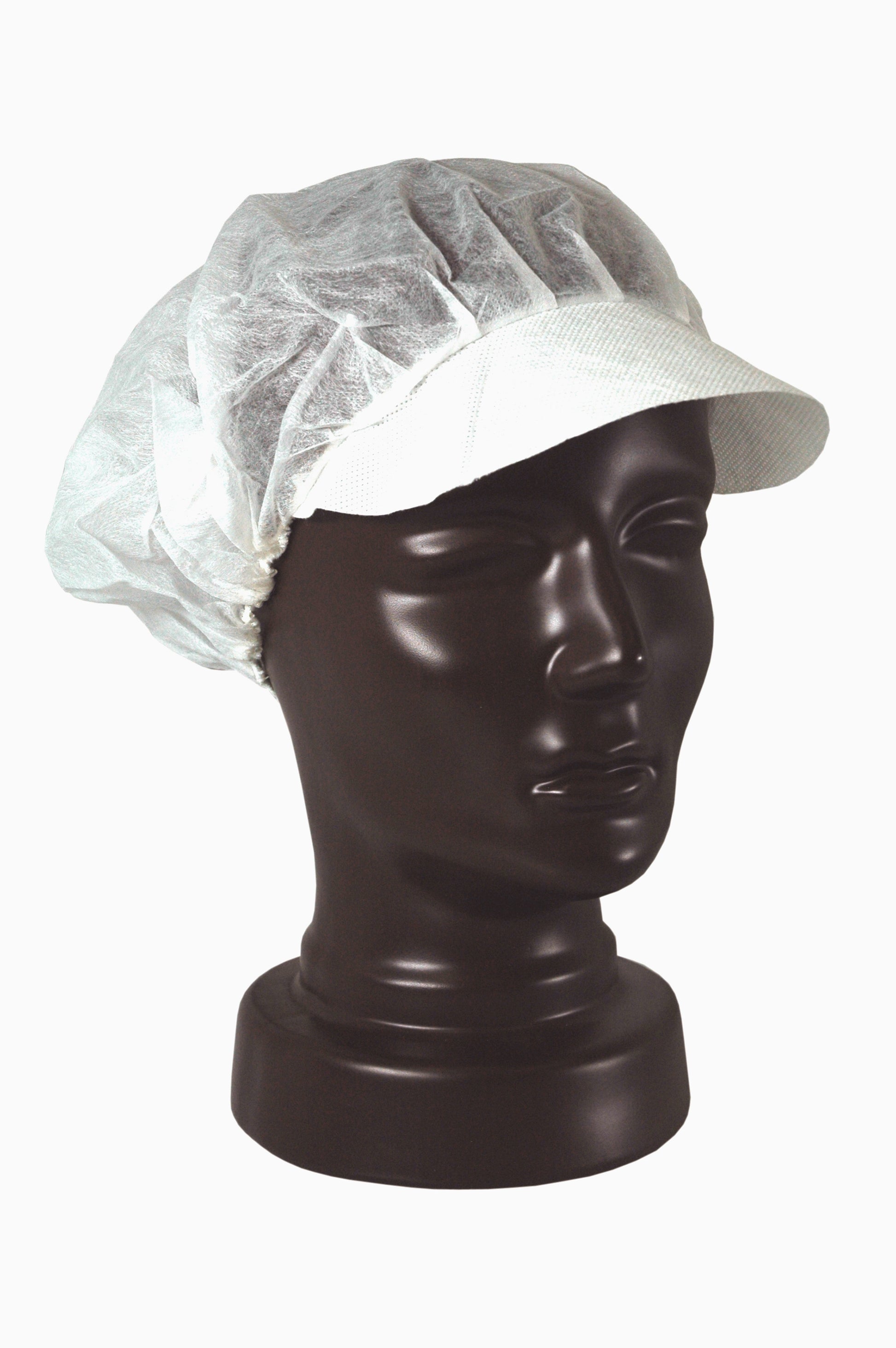 Einweghaube aus weissem Vlies mit Schild und Gummizug, für völlige Haarbedeckung und gutes Erscheinungsbild.