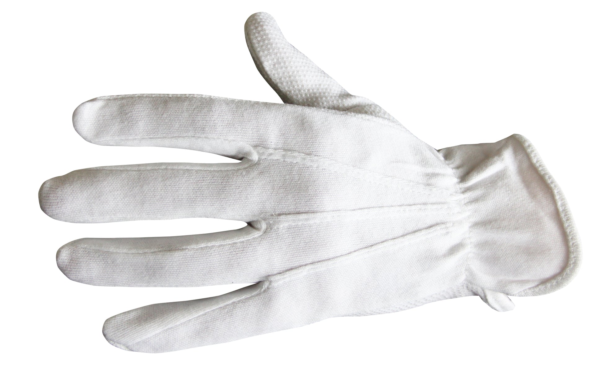 Weisse Baumwollhandschuhe aus Noppen. Geeignet für Montageinsätze. Erhältlich in verschiedenen Grössen.