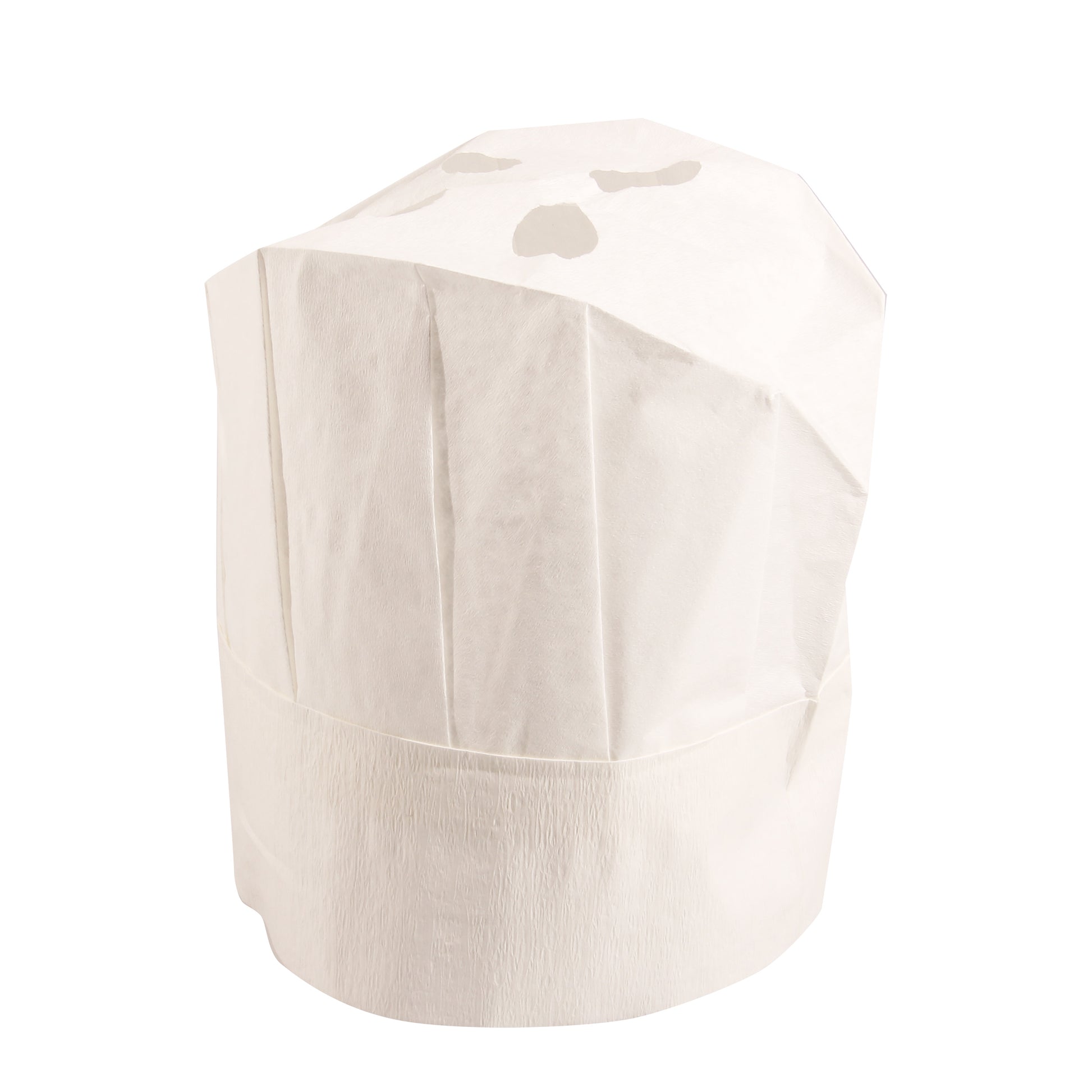Komfortable Kochmütze, auf jede Kopfgrösse einstellbar, Oberteil aus feinem Krepp mit Öffnungen auf der Oberseite für optimale Luftzirkulation. Höhe 235 mm, bedruckbar mit Ihrem Namen oder Logo. Erhältlich im Weita-Dispenser zum Aufhängen.