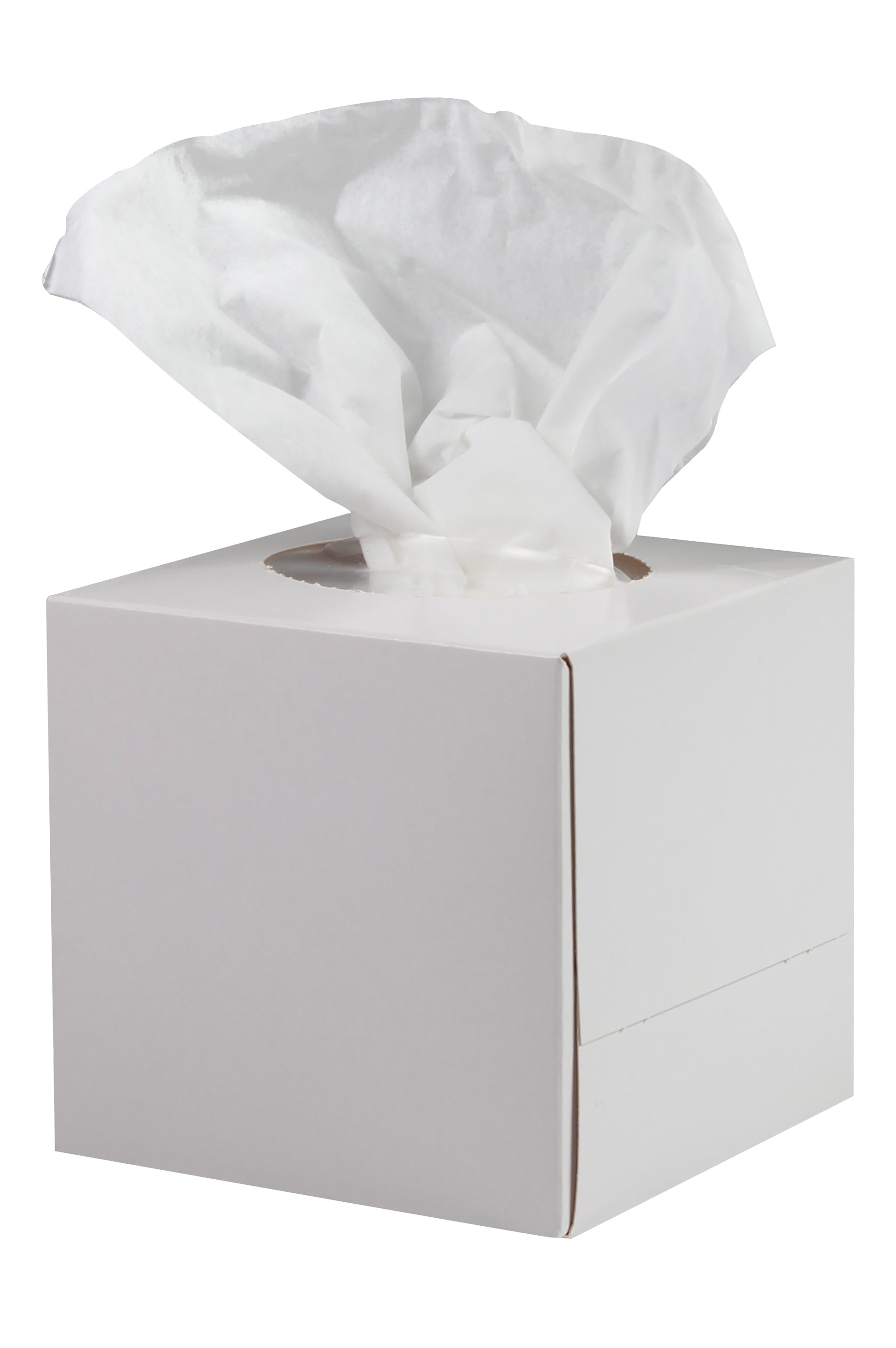 Zweilagige Kosmetiktücher, verpackt in neutraler Würfelbox.