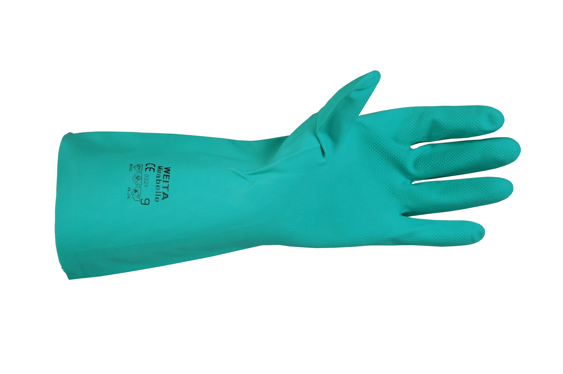 Ein beliebter widerstandsfähiger Handschuh, der beständig gegen Öl, Fett, Bleichmittel und Lösungsmittel ist und somit eine ausgezeichnete chemische Beständigkeit mit sich bringt. Die Innenseite ist velourisiert und verbessert somit die Trageigenschaften. Die Aussenseite hat ein feines Profil, was ein überaus gutes Tastempfinden ermöglicht. Der Mirabelle Handschuh zeichnet sich besonders durch seine hohe Abrieb- und Reissfestigkeit aus.