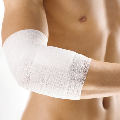 Die kohäsive bielastische Fixierbinde mit besonderem Dehnungsverhalten haftet auf sich selbst, nicht aber auf Haut und Haaren.