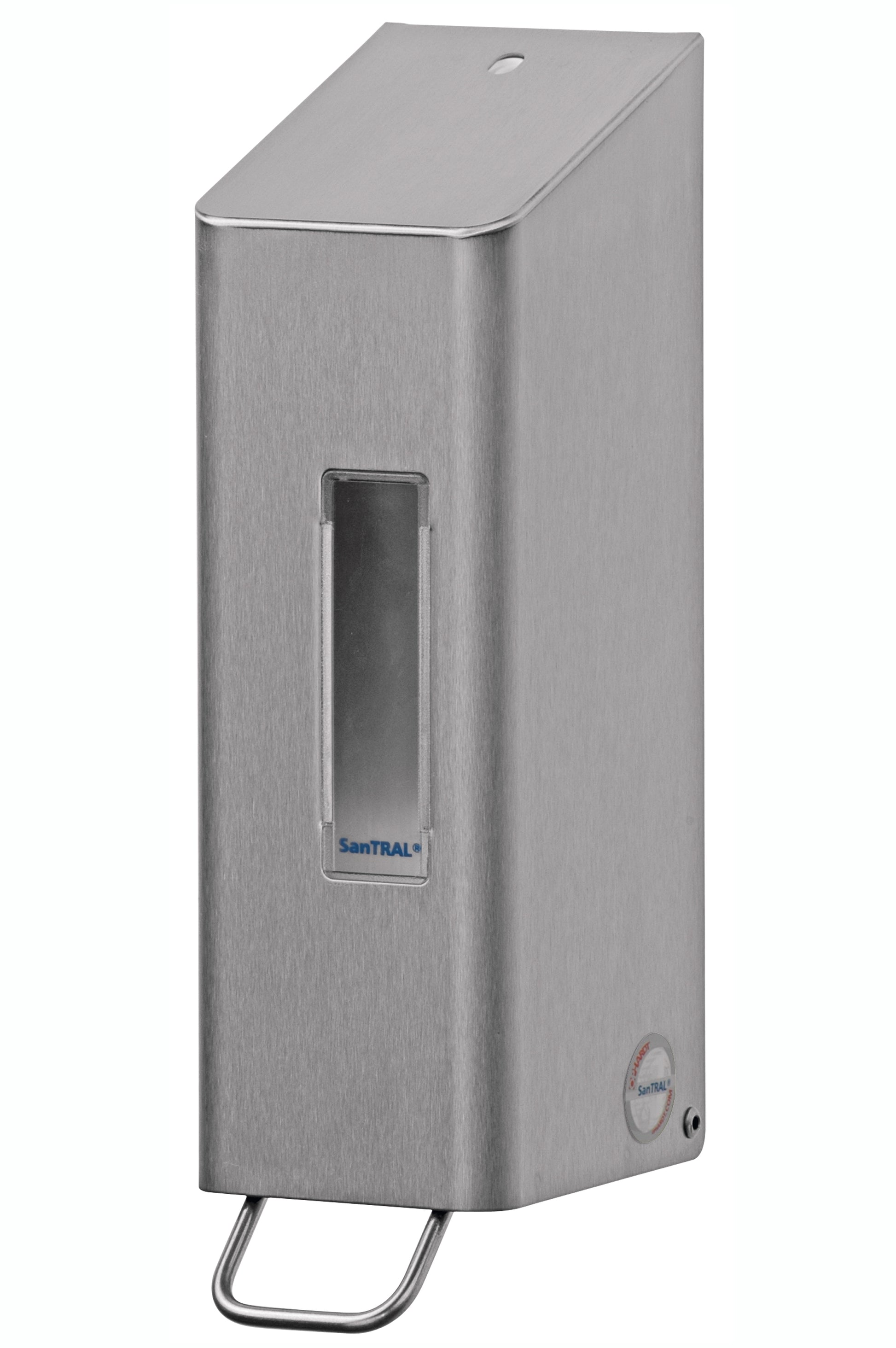 Nachfüllbarer Edelstahlspender einsetzbar für Flüssigseifen und Desinfektionsmittel (Behälter-Pumpen-Einheit Typ S), mit einem Fassungsvermögen von 600 ml, Anti-Fingerprint-Beschichtung (AFP), Schloss und Sichtfenster. Bedienungshebel aus Edelstahl, mit Druckbetätigung. Robuster, hochwertiger Spender. Behälter-Pumpen-Einheit austauschbar. Das Produkt ist verpackt im Karton à 1 Stück.