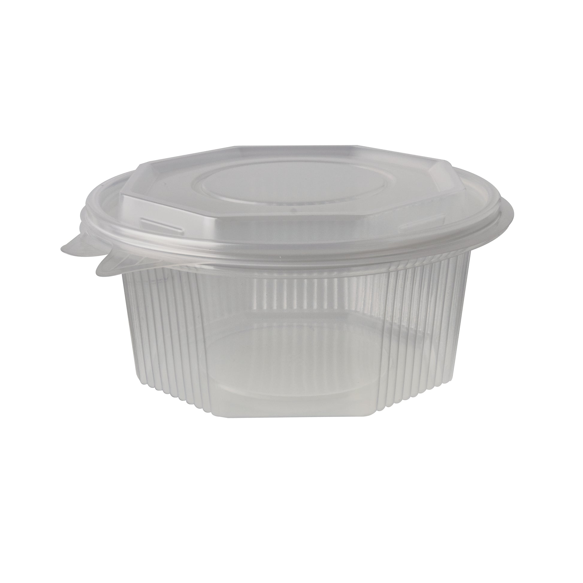 Ein transparenter Verpackungsbecher mit anhängendem Klappdeckel. Der Deckel ist Abreisbar.