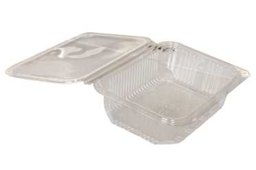 Rechteckschalen mit einem flachen Scharnierdeckel aus PET (Polyethylenterephtalat), verfügbar in verschiedenen Grössen. Verwendbar z.B. als Salatschale.