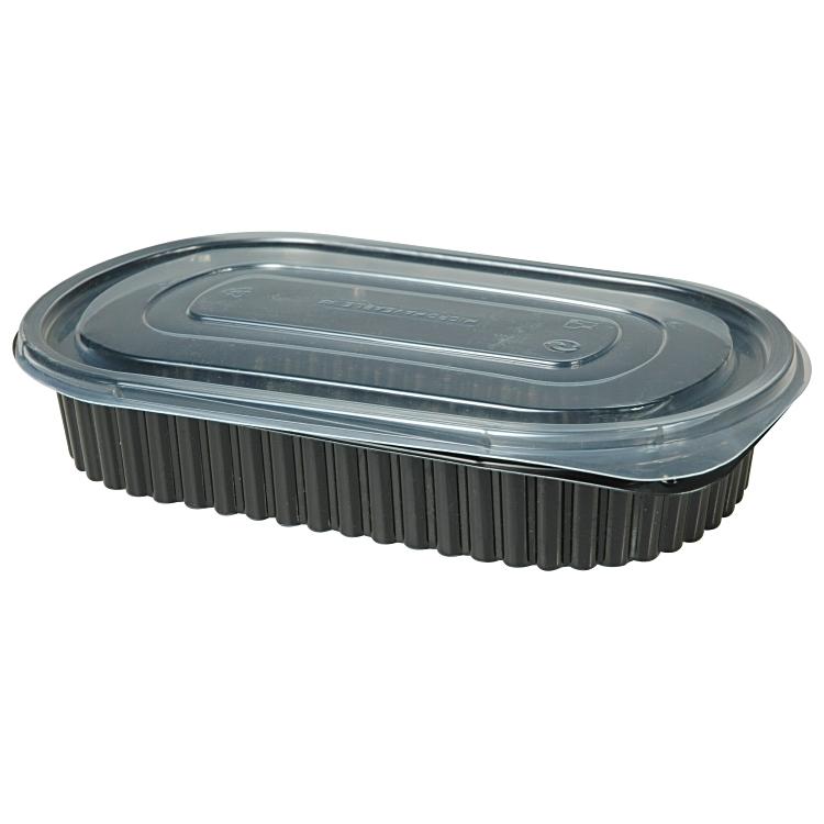 Mikrowellentaugliche, ovale Verpackungsschale aus schwarzem Polypropylen (PP), mit einer Füllmenge von 900 ml und einer Grösse von 25.8 x 18.3 x 3.6 cm. Zur Schale ist ein passender Deckel separat erhältlich. Geeignet als Ausser-Haus-Verpackung / Take-Away-Verpackung. Das Produkt ist verpackt im Karton à 400 Schalen (Stück).