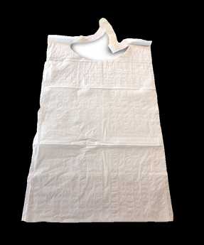Schutzservietten von Ontex aus chlorfrei behandeltem Zellstoff. Integrierter Beutel für Krümel. 1 Polyethylenfolie auf der Rückseite, die gegen den Patienten gelegt wird, und 1 Papierfolie auf der Vorderseite. Abgerundeter Halsumfang