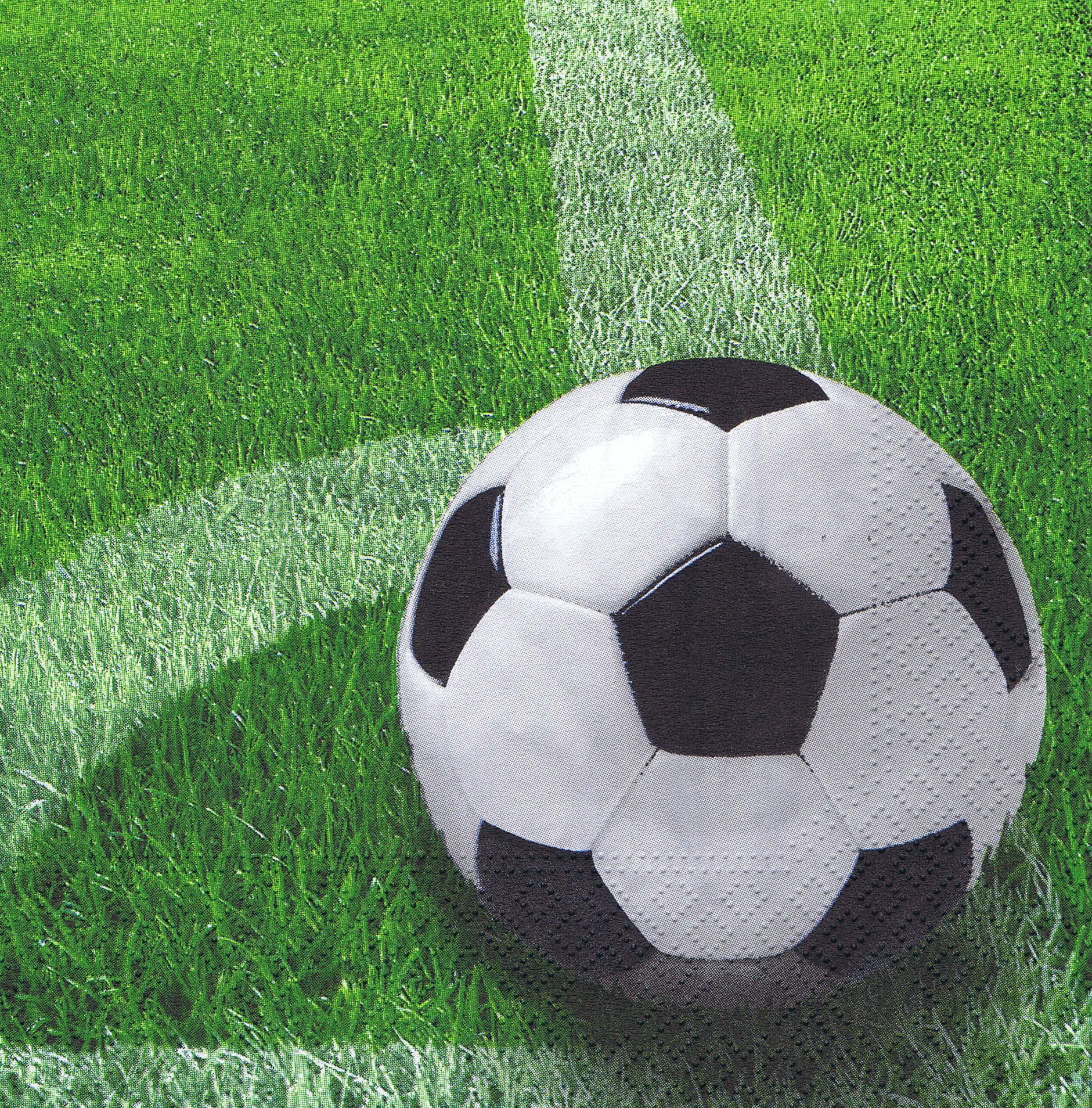 Umweltfreundliche, dreilagige Servietten mit Motiv Football, 33 x 33 cm gross, in 1/4-Falz, verpackt in der Packung à 20 Servietten. Die Servietten sind bedruckt mit Farben auf Wasserbasis, ohne optische Aufheller und sind FSC und Nordic Swan zertifiziert.