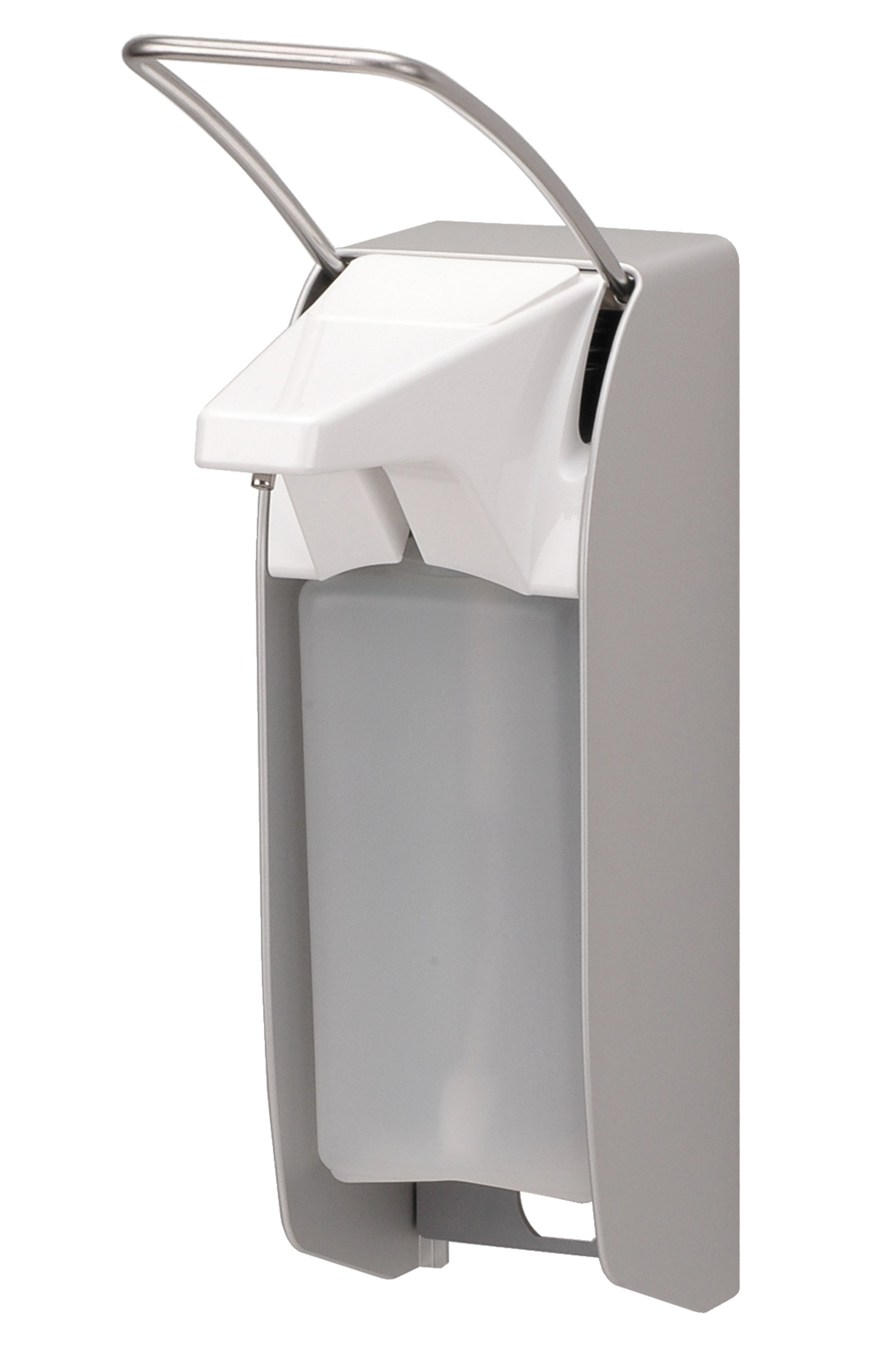 Nachfüllbarer Spender aus eloxiertem Aluminium, einsetzbar für Desinfektionsmittel und auch Flüssigseifen, mit einem Fassungsvermögen von 500 ml. Der Spender ist ausgerüstet mit einem kurzen Edelstahlbedienungshebel (Typ E, 160 mm lang) mit Druckbetätigung, einem Kunststoffnachfüllbehälter und einer austauschbaren Edelstahlpumpe mit gekröpftem Saugrohr (Typ 24). Der robuste, hochwertige Spender ist spülmaschinenfest und autoklavierbar. Das Produkt ist verpackt im Karton à 1 Stück.