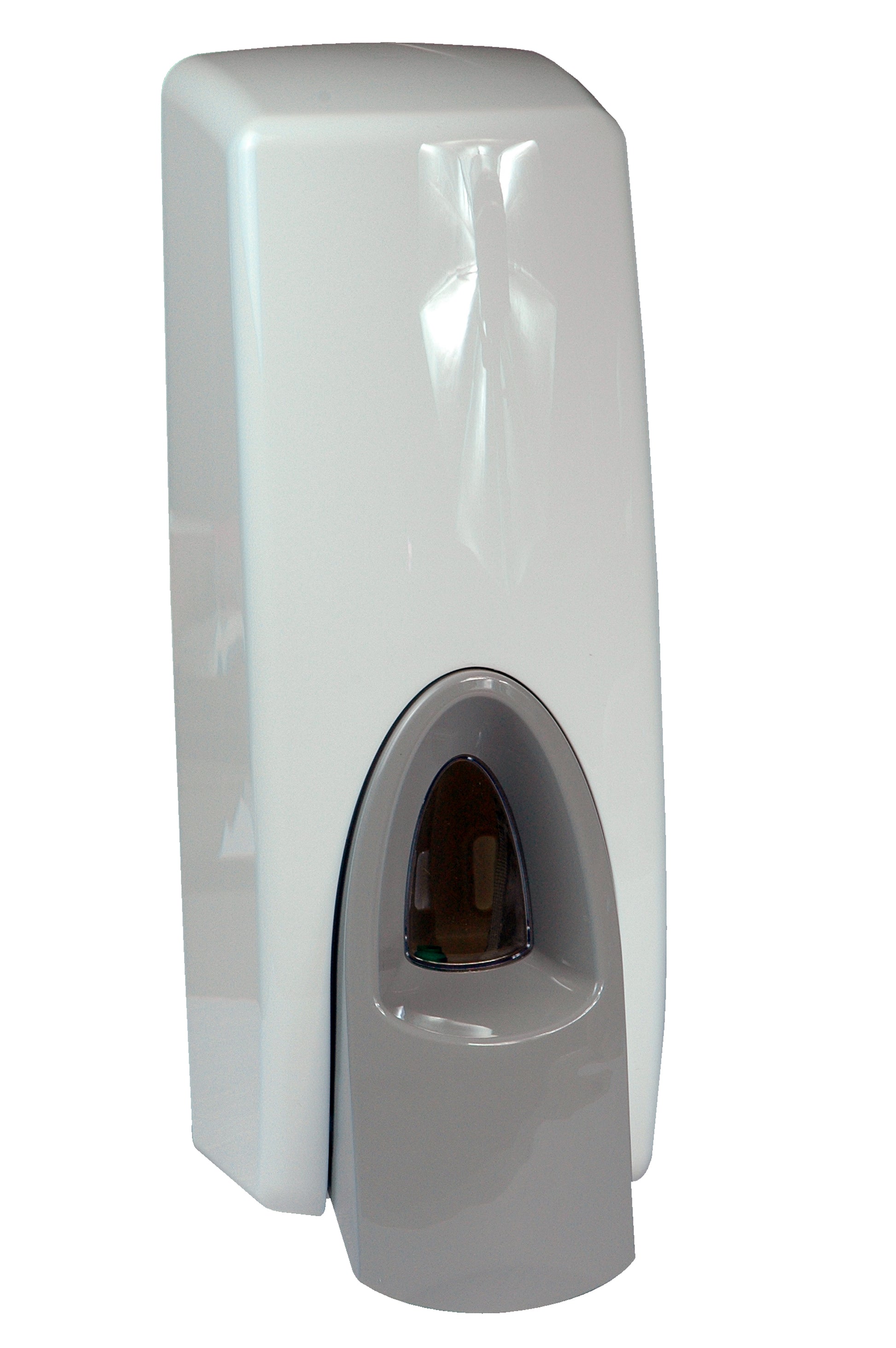 Spender aus weissem Kunststoff. Der Spray Soap ist ein Kosten sparendes und umweltfreundliches Seifensystem. Der patentierte Seifenspender verteilt einen Seifennebel und verbraucht bis zu 60% weniger Seife als traditionelle Seifensysteme.