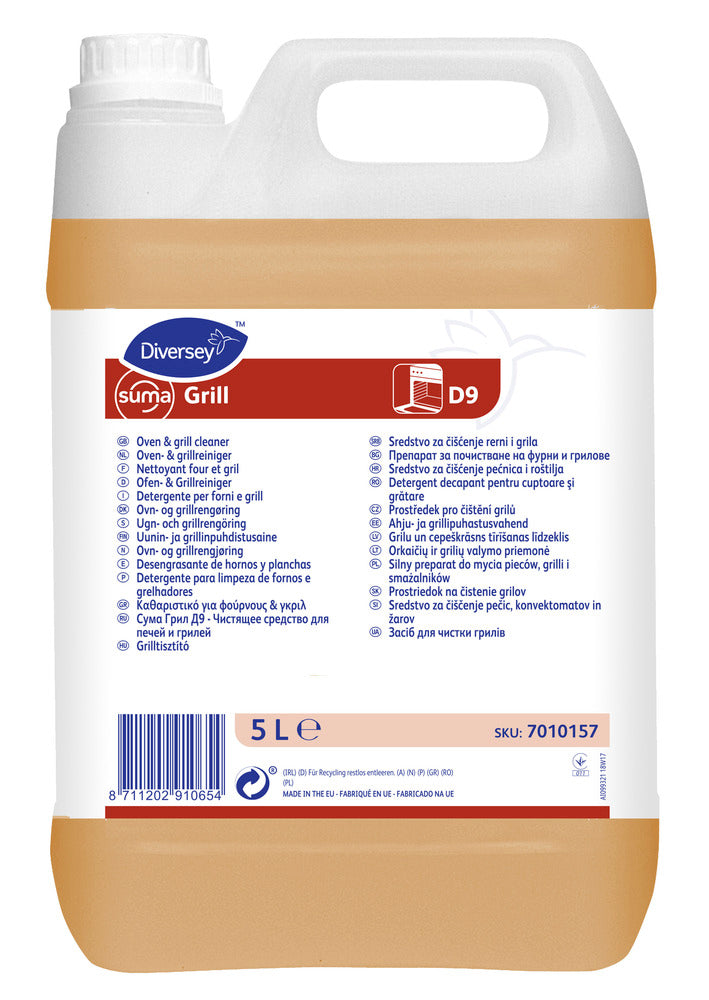 Suma Grill D9 ist ein hochalkalischer Ofen- und Grillreiniger für stark verschmutzte Bereiche in Küchen. Er löst Fett, Öl und selbst stark eingebrannte Verschmutzungen in Öfen, Grills, Konvektomaten oder Salamandern. Mit Wasser verdünnt können auch Friteusen damit gereinigt werden. Er eignet sich insbesondere für Lebensmittelproduzierende und -verarbeitende Unternehmen.