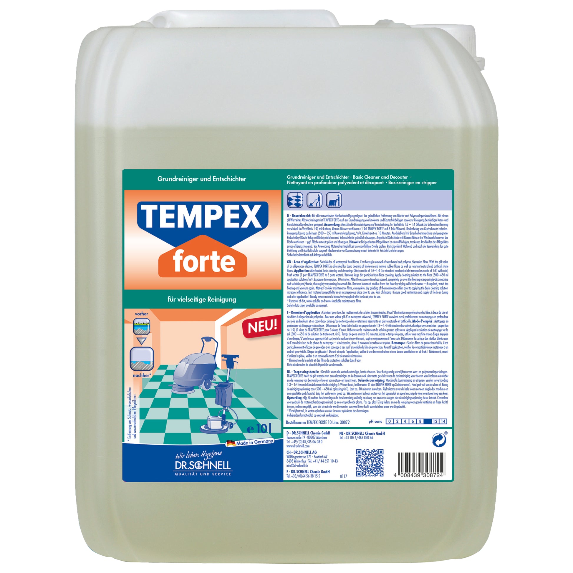 Das flüssige Hochkonzentrat ist ein vielseitiger Grundreiniger und Entschichter zur Entfernung von Schmutz und wasserunlöslichen Pflegefilmen. Er ist geruchsarm und schaumarm. Tempex Forte ist für alle wasserfesten, auch alkaliempfindlichen Hartbodenbeläge geeignet.