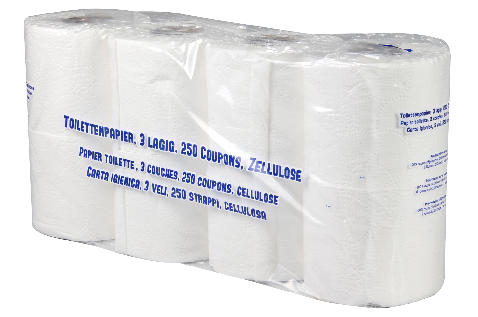 Dreilagiges Toilettenpapier, aus weisser Zellulose, auf der Rolle à 250 Coupons, neutral verpackt.