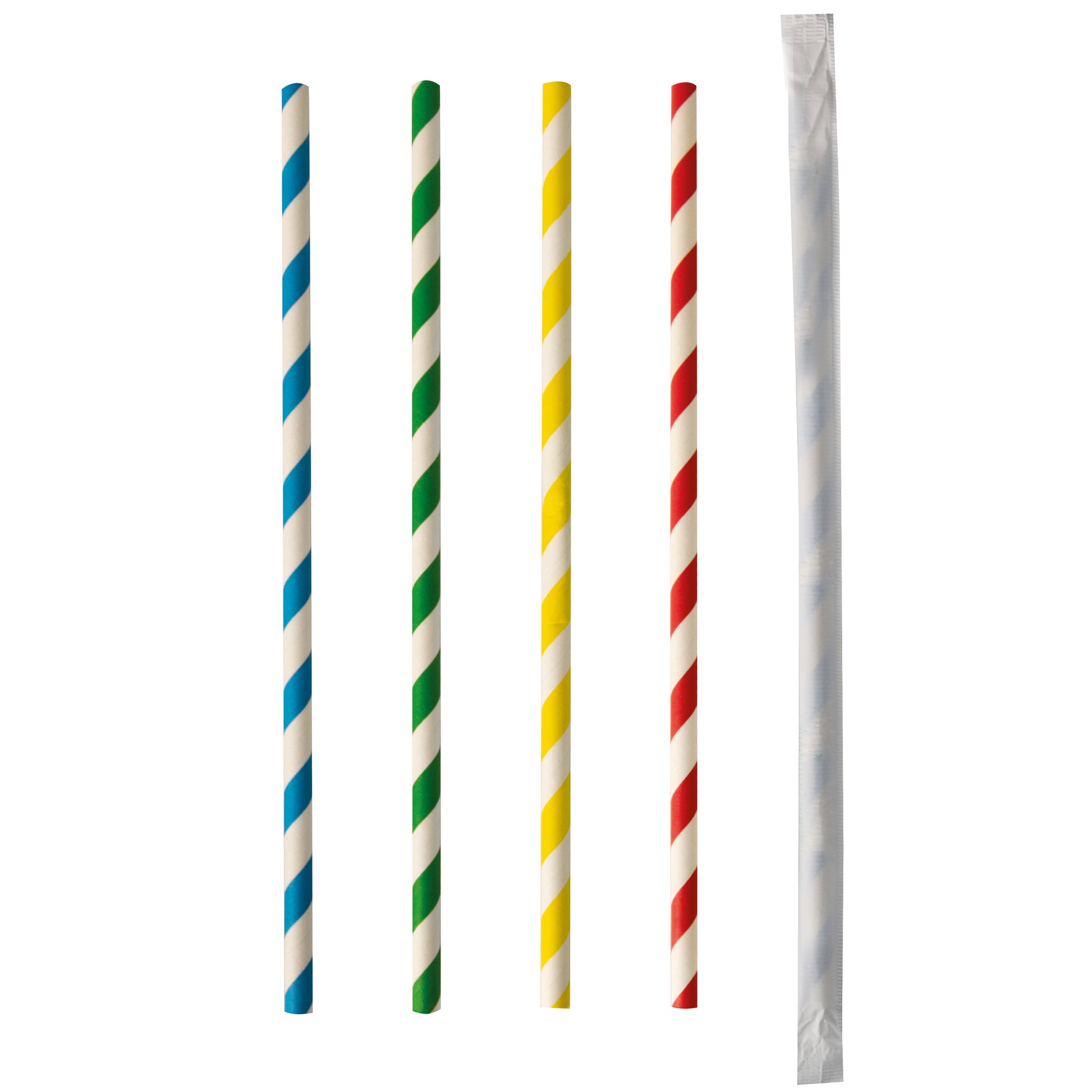 Gerade (ohne Knick) Trinkhalme für Cocktails, Drinks, Limonaden & Erfrischungsgetränke aller Art aus Papier mit einer Länge von 20 cm und einem Durchmesser von 6 mm. Die Trinkhalme sind besonders hygienisch, da sie einzeln in Papier gehüllt sind.