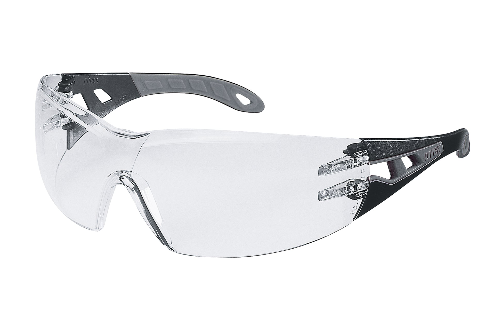 Moderne Schutzbrille mit sehr grossem Sichtfeld ohne Rahmen. Die Brille aus transparentem Polycarbonat, mit schwarz-grauen Bügeln verfügt über eine duosphärische Scheibe mit Uvex supravision-Beschichtungstechnologie, ist komplett metallfrei, innen beschlagfrei und aussen extrem kratzfest.
